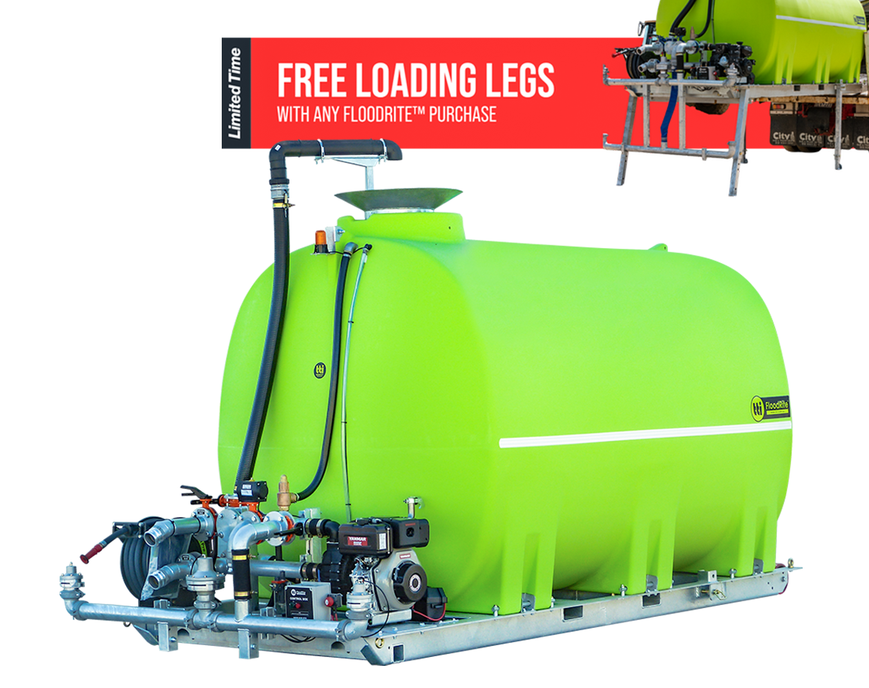A quality slip-on water cart, like TTi’s FloodRite, incorporates an easy self-loading leg system. Simply reverse with the tipper body slightly raised, the front legs then swing up, and the rollers allow the unit to safely slide in all the way.